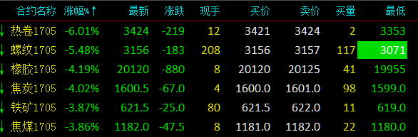 3日早盘,黑色系集体大跌,其中热卷和螺纹钢触及跌停,焦炭、焦煤亦跌4%左右。