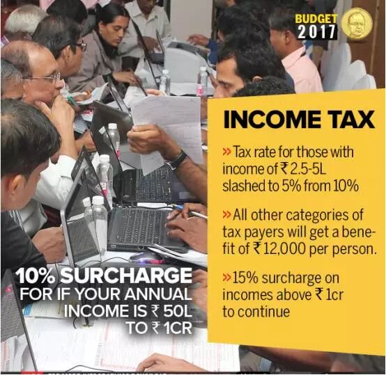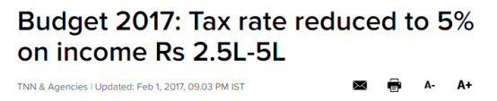 据印度当地媒体timesofindia 2月1日报道,印度财政部长艾旺·加特利( Arun Jaitley)公布了印度最新的年度财政预算,在预算中他将年收入在25万卢比(约合人民币25530元)到50万卢比(约合人民币51060元)之间人群的个人所得税税率从10%下调至5%。