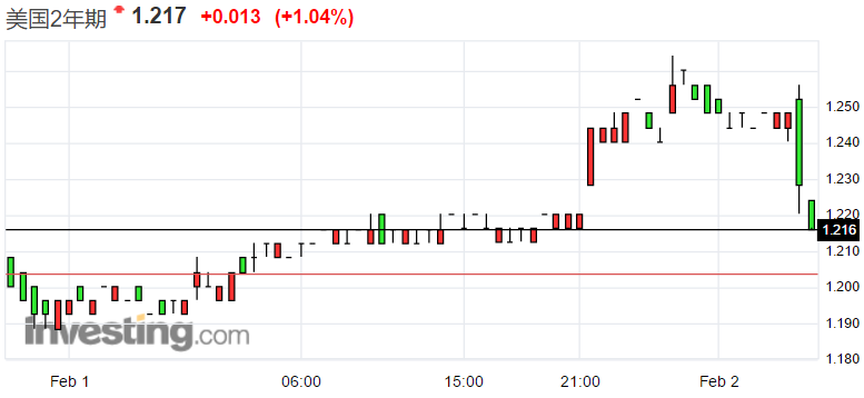 美国两年期国债收益率短线回落3.6个基点最低触及1.220%,脱离年内最高位1.264%,现报1.217%,日涨幅1.04%。