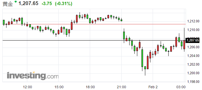 现货黄金短线上扬7.05美元最高触及1210.21美元/盎司,现报1207.65美元/盎司,日跌幅0.31%。
