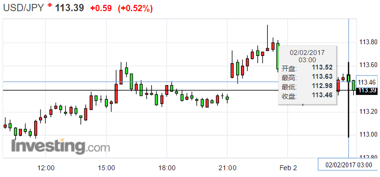 美元兑日元在FOMC决议声明发布后跳水65点最低触及112.98,现报113.39,日涨幅0.52%。