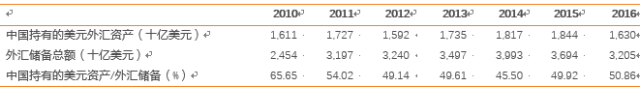 表3:中国持有的美元资产占外汇储备比例2010-2016