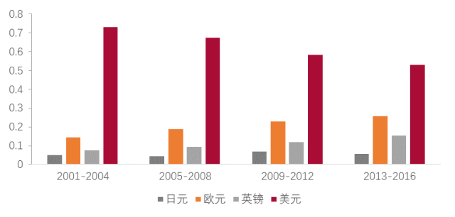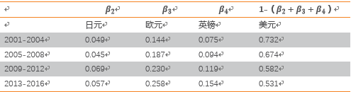 )即为美元资产占外汇储备的比例。我们使用的数据样跨度本为2001年1月—2016年12月,每4年进行一次回归,测算结果表示的该回归时间段内外汇储备构成的平均情况。