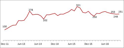 1月25日,中国银行发布2016年11月跨境人民币指数(CRI)。结果显示,11月份 CRI指数为251点,较上月上升3点,较上年末下降25点。本月指数运行有以