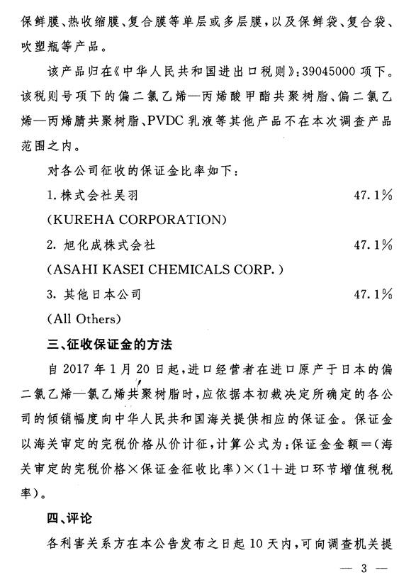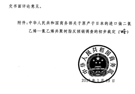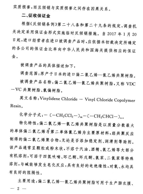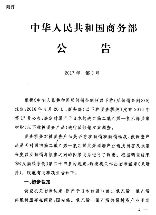 根据《中华人民共和国反倾销条例》的规定,商务部决定自2017年1月20日起,对进口原产于日本的偏二氯乙烯-氯乙烯共聚树脂(税则号列:3904.5000)采用保证金形式实施临时反倾销措施。商务部为此发布了2017年第3号公告(详见附件),并明确了实施临时反倾销措施产品的具体商品范围。现就有关事项公告如下: