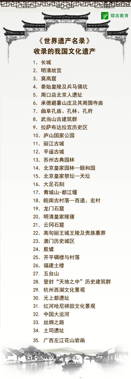 据了解,中国自1985年加入联合国教科文组织《保护世界文化和自然遗产公约》,迄今已有50处遗产列入《世界遗产名录》,包括35项文化遗产,11项自然遗产和4项自然和文化混合遗产,总数位居世界第二。