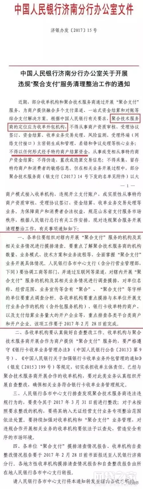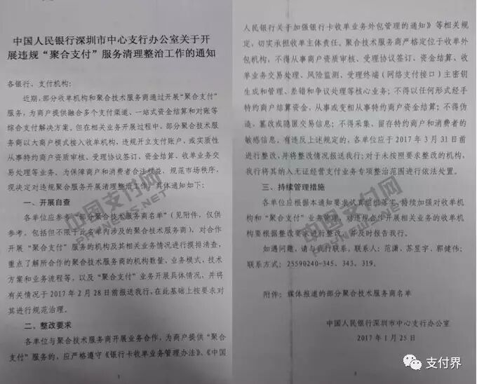 春节前夕,央行总行统一安排下发了《关于开展违规”聚合支付“服务清理整治工作的通知》(下称《通知》)的消息传得沸沸扬扬。2月6日,网络再流出多个地方省市如济南人行、深圳市中心支行等地发布的有关通知文件,证实了上述传闻。值得一提的是,网贷之家从多份文件中发现,《通知》均附有32家聚合支付公司具体名单。
