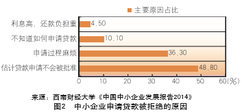 另一方面,中小企业融资难、融资贵问题依然存在。融资难方面,根据西南财经大学发布的《中国中小企业发展报告》,在全国约5800万家中小企业中,25.8%的中小企业有正规借贷需求。然而在这些企业中,只有46%的企业获得银行贷款,11.6%的企业申请被拒,还有42.4%未申请(如图1和图2)。这表明当前中小企业信贷可获得性偏低,供需错配的现象较为严重。融资贵方面,2015年国家审计署抽查了9个省份的部分商业银行和141户中小企业发现,中小企业融资成本普遍偏高。在样本中的30户企业84笔贷款中,46笔承担了利息成本之外的其他费用,个别企业从商业银行贷款当年的实际成本高达12.5%,从小额贷款公司取得的贷款综合成本更是高达30%。究其原因,中小企业不仅承担了直接融资成本(包括贷款利率及其上浮部分),还承担大量的间接融资成本(包括增信成本、寻租成本和“挤占成本”等),甚至产生利润和利息“倒挂”现象,严重加剧了中小企业的经营负担。据调查,我国小微企业贷款不良率上升的背后是大企业拖欠中小企业货款。这在湖北辖内WHZY企业流动性风险事件中表现得十分突出。截至2014年8月底,该企业融资总额合计60.4亿元,其中银行融资48.1亿元(含供应链融资16.1亿元)。而同期该企业应收账款总额高达40亿元,仅辖内一家大型央企就拖欠该企业19亿元货款。