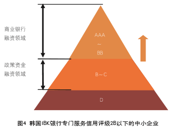目标不明确。美国学者艾迪思于1989年提出企业生命周期理论,将企业划分为种子期、初创期、成长期、成熟期、衰退期等阶段。不同生命周期的企业融资结构和特点迥异,处于初创和成长阶段的中小企业往往资金需求旺盛,但由于发展前景不确定和缺乏抵质押资产,难以获得较高的信用评级,达到银行的授信门槛,因而是融资难贵问题较为集中的群体。为解决这一问题,各国普遍重视对初创期和成长期企业的特别支持,有的还成立专门的金融机构予以融资支持。如韩国通过IBK银行的融资扶持,将初创期和成长期的“弱质企业”(通常信用评级为B~C)引领为“优良企业”(信用评级为AAA~BB),使之达到商业银行授信标准后退出,从而实现政策金融与商业金融的“无缝对接”,有效缓解了韩国中小企业的“彼得潘症候群”(如图4)。而我国一些政策像“撒胡椒粉”,没有对中小企业类型进行细分,不加区别地予以支持。实践中商业银行往往对成熟期企业“锦上添花”,助长其多头融资、盲目扩张的倾向,而对初创和成长期企业不会“雪中送炭”,导致其寻求高成本民间借贷饮鸩止渴。据国家统计局在某市对264家新设中小企业的调查显示,87%有融资需求的企业未获得融资。