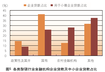 渠道不健全。“麦克米伦缺口”实质是一种市场失灵,需要发挥政府有形之手的作用,通过政策性金融加以引导和支持。韩国金融界认为,金融支持的领域分为三块:一是市场支持领域;二是支持事业转换领域(既可能是市场支持,也可能是政策支持);三是政策资金提供领域。IBK银行重点支持第三块即市场失败领域的企业创业、技术开发和长期设施投资等。相比较而言,我国现有的金融体系不健全,融资没有全覆盖许多处于初创期和成长期的中小企业,部分中小企业金融服务存在渠道盲区,可获得性严重不足。从图5可以看出,2015年年末银行业金融机构中小企业贷款中占比最高的为国有商业银行,其次为农村金融机构。而政策性银行(含国家开发银行)在整个银行业金融机构的中小企业贷款中仅占9%。这些数据均显示我国的政策性银行在中小企业贷款方面作用没有充分发挥。从另一方面来看,我国政策性银行的企业贷款占银行业金融机构企业贷款的比例为14%,而用于中小企业的贷款仅占9%,也反映出政策性银行将更多的贷款投放到大中型企业。