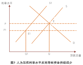 重点不突出。按照经济学基本原理,商品的价值由社会必要劳动时间决定,但其价格却取决于供需状况,资金作为一种特殊商品也受这一规律支配。由于中小企业经营具有脆弱性,加上社会征信和增信体系不健全,因此获得贷款难度较大,即使获得贷款也要付出较高的利率风险溢价。可见,在中小企业融资难和融资贵的矛盾中,融资难是主要矛盾或者说矛盾的主要方面,融资贵是次要矛盾或者说矛盾的次要方面。要解决这一对矛盾,应当把融资难放在首位,融资难的问题解决了,融资贵的问题自然事半功倍。但在实践中,各种政策愿望是好的,但现实是残酷的,结果往往不尽如人意,原因就在于政策重点不突出、协同性不够。如一些政策文件不是着力于缓解融资难,而是片面强调降低融资成本,甚至人为规定不得上浮贷款利率,如果行政干预下的贷款利率低于市场均衡利率(如图3所示P1<P),将影响商业银行放贷积极性,导致资金供给曲线左移。在给定的利率水平下,中小企业获得的贷款总量反而减少(Q1<Q),进一步加剧了融资难的问题。同时,在贷款利率被人为压低的情况下,商业银行往往会通过隐性的不合理收费补偿风险损失,融资贵的问题实际上也没有得到根本解决。
