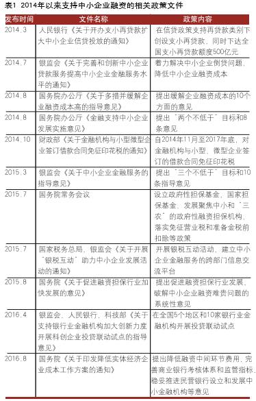 一方面,货币持续宽松、政策支持力度不断加大。近年来,央行通过降准降息或创设新型借贷工具等手段放宽货币信用,2015年年末我国M2余额达到139.2万亿元,同比增长13.3%,是GDP的2倍多;2015年全社会融资规模增量15.4万亿元,金融机构各项贷款余额99.3万亿元,增加11.7万亿元。表面上看,市场流动性充裕,中小企业不缺资金来源。同时,国务院、各部委相继出台了一系列政策文件,采取有力措施助力中小企业融资发展(如表1)。特别是在监管部门的推动下,中小企业贷款增速明显回升。2015年年末,全国中小企业贷款余额达到23.5万亿元,占各项贷款余额的23.9%,同比增速高于各项贷款平均增速0.4个百分点,实现了“三个不低于”目标。