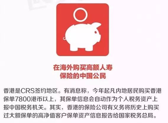 在海外购买超过一定金额的高额人寿保险的中国公民也将在交换信息之列,比如前一段很多内地居民热衷到香港买人寿保险显然就要受到影响了。有消息称,今年起凡内地居民购买香港保单7800港币以上,其保单信息会自动作为个人税务资产上报中国税务机关。此信息会作为多项调查的依据,包括资产来源的合法性、资产出境的合法性、缴税的合法性等。事实上,不仅是今年新购买香港保险的内地居民受到影响,由于香港是CRS签约地区,因此香港的保险公司有义务将历史上购买过大额保单的高净值客户的保单资产信息报告给国家税务总局。