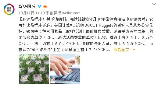 另据@新华国际 微博报道,美国计算机培训机构CBT Nuggets的研究人员从办公室鼠标、键盘等5种常用物品上取样检测上面的细菌数量,以每平方英寸面积上的菌落形成单位(CFU,表达活菌数量的单位)比较,键盘上有354.3万个CFU,手机上约有160万个CFU,最脏的是出入证,有462万个CFU。而被认为“藏污纳垢”的卫生间马桶座上有172个CFU。