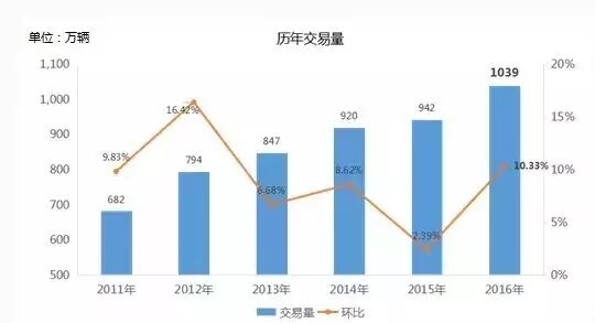 交易量从2010年400万突破到2016年千万辆