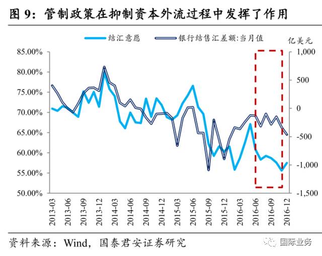 但2016年下半年,二者出现了一段背离,结汇意愿持续下降但资本流出却减缓了,意味着出现了某种“扭曲”力量,事实上就是“管制”政策的强化。