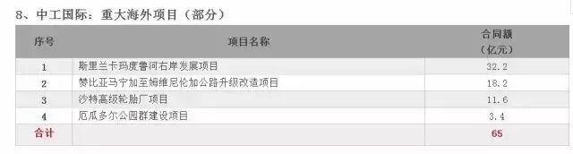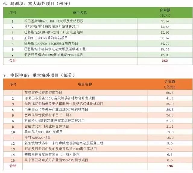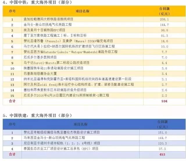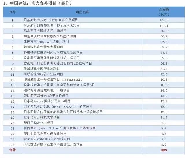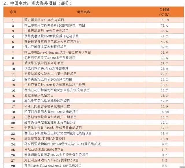 以下是2016年海外承包主力公司的海外重大项目列表,其中联合体项目的合同额数据为整体合同额: