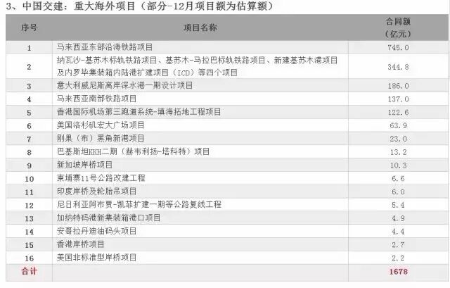 中国交建前3季度海外新签合同额1300亿元,2016年大项目额达到1678亿元,可以预计,中国交建2016年度总的海外新签合同额很可能达到1500亿元,甚至1800亿元,将刷新我国建筑企业对外承包记录;