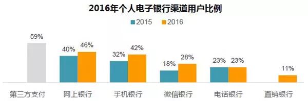 2016年,在地级以上城市13岁及以上常住人口中,网上银行用户比例为46%,手机银行用户比例为42%;微信银行、电话银行、直销银行用户比例分别为28%,23%和11%。
