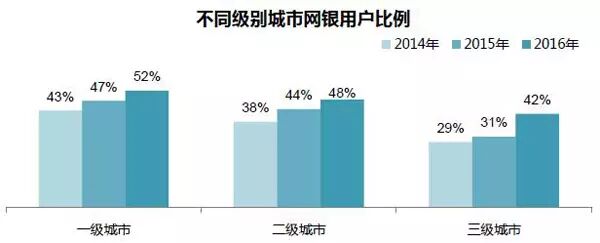 2016年,个人网银用户比例在一二三线城市分别为52%、48%、42%,用户比例呈现随城市级别逐级下降趋势;三线城市用户比例紧追二线城市,三线城市与一二线城市“数字化鸿沟”特点不再显著。