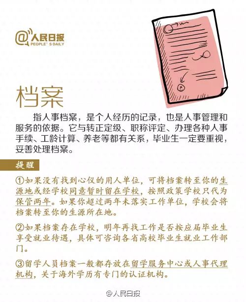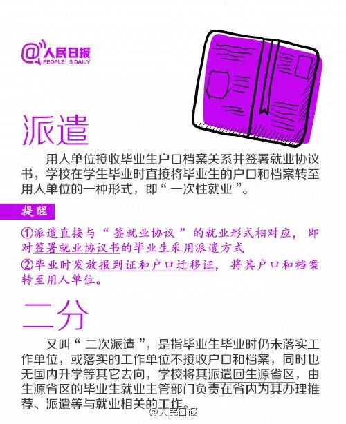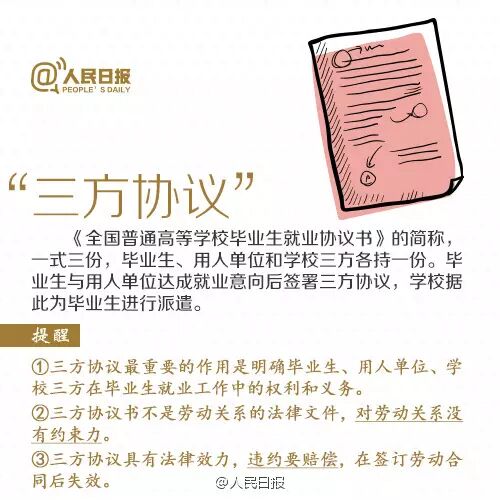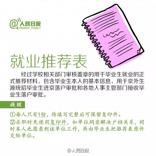 丨来源:人民日报微博①就业推荐表:经学校相关部门审核盖章的正式推荐材料,每人只有一份;②三方协议:毕业生、用人单位和学校各持一份,学