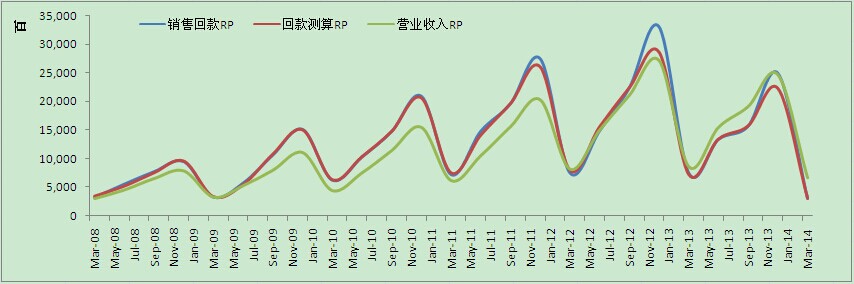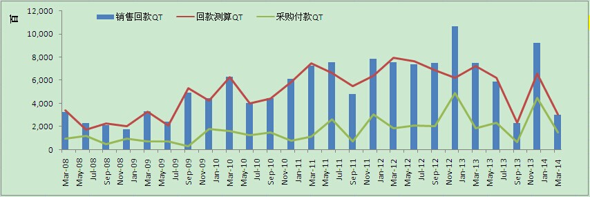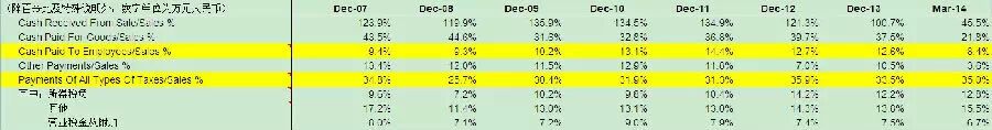 上图是各期财报回款和收入的情况,回款测算=营业收入*1.17-应收账款增加-应收票据增加+预收账款增加。从上面六年的图谱看,前三年很正常,后三年出现了较大的偏差,现金流量表里的销售回款金额小于测算的金额是很正常的(因为有票据背书的情况),但这个案例有点不合逻辑(我也很纳闷,本来还以为可能是受财务公司的影响,但一查14年才获批),综合判断下来我认为这里很可能存在调节,11年虚高14.5亿,12年虚高44.2亿,13年虚高26.5亿,三年一共虚高85.2亿。