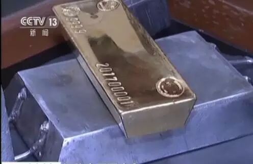 央视记者郭薇:现在我的眼前是满眼的金光闪闪,这就是刚刚生产出来的国际免检标准的金锭,这一块金锭的重量是12.5公斤,我一只手完全拿不起来,哇,两只手也很困难,这一块金锭大约价值300万人民币,这就是我们国家金库里存放的储备黄金。