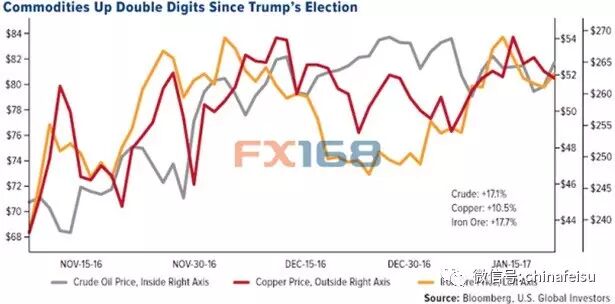 在美国大选日和就职典礼日期间,大宗商品指数攀升5.4%,原油、铜和铁矿石均收获两位数增幅,分别增长17.1%、10.5%和17.7%。