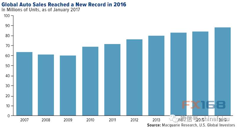 全球制造业改善的例证之一就是汽车销售。去年全球汽车销售达到8810万辆的纪录新高,较2015年增长4.8%。
