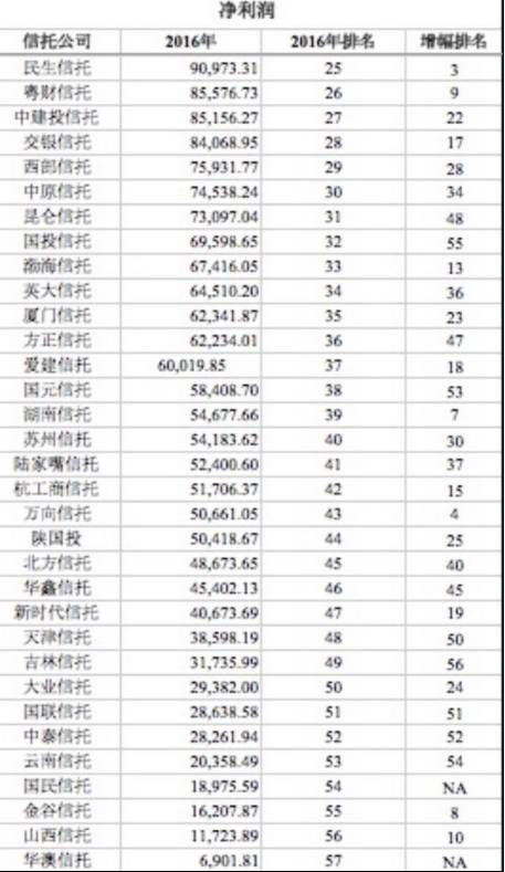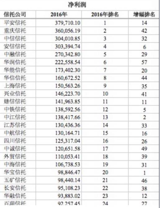 根据银行间市场披露的60家信托公司2016年未经审计财报数据显示,平安信托以37.97亿元的净利润拔得信托公司盈利最高的宝座头筹,重庆信托和中信信托分别以36.01亿元和30.4亿元位列第二、第三位。2016年盈利能力位居行业前十的信托公司还有安信信托、中融信托、华润信托、华能信托、华信信托、上海信托和兴业信托。