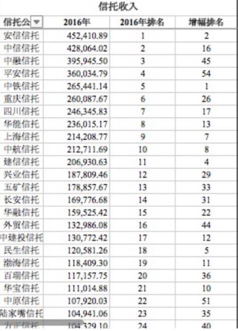 从信托业务指标来看,近年来业绩表现抢眼的安信信托以45.24亿元首次夺得榜首之席,中信信托和中融信托分别以42.81亿元和39.59亿元位列第二、第三。据第一财经记者统计,已披露2016年财报数据的信托公司信托业务收入合计725.9亿元,行业56家同比可比信托公司平均信托业务收入12.47亿元,同比增长6.7%。