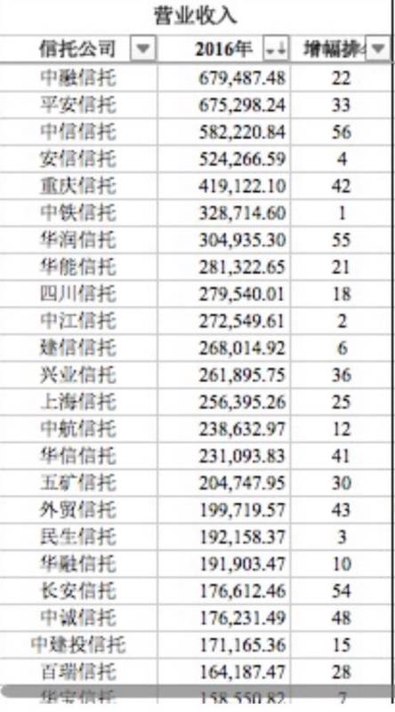 从营业收入指标来看,排名第一的中融信托和排名第二的平安信托分别为67.95亿元、67.53亿元不相上下,中信信托则以58.22亿元位列第三。据第一财经记者统计,已披露2016年财报数据的信托公司营业收入合计1071.46亿元,行业57家同比可比信托公司平均营业收入18.19亿元,同比下滑5.26%。