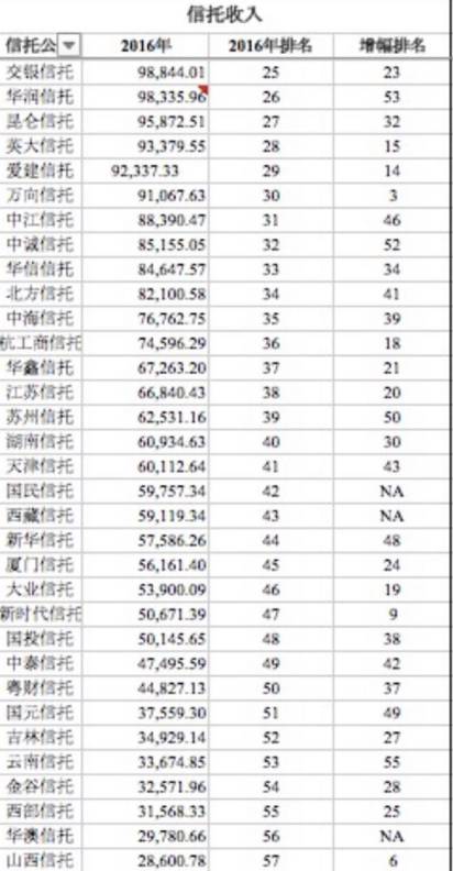挺进第一梯队的信托公司自然实力彰显,而从下游逐步步入中等梯队的信托公司也可圈可点。其一是民生信托以9.1亿元的净利润跃居第25位,重组以来排名不断晋升。其二是另一匹“黑马”型选手,中江信托2016年实现营业收入27.25亿元,净利润13.84亿元,在60家信托公司中排名第13位。