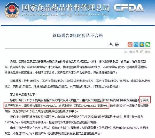 日前,国家食品药品监督管理总局在官网上发布通告称,在近期的抽检中,发现不合格样品4批次,其中乐百氏(广东)桶装水发展有限公司武汉分公司生产的18.9升装乐百氏饮用天然泉水被认定溴酸盐超标40%,生产日期为2016年8月16日。
