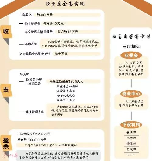 “我们的物业中心员工,包括物业主管在内全部是自聘的。”冼敏强介绍,如今业委会形成了三层框架,其中业委会共有10位委员,资金统归业委会调配,物业中心直属业委会,下设保安部、工程部、清洁部、行政部等部门,“我们就相当于一个公司,也正常给员工发工资和缴社保。”冼敏强说,不同的是,业委会10位委员全部为兼职,不拿取一分钱工资。而与企业的逐利相比,业委会则将所有的“盈余”用于整个小区的翻新建设。