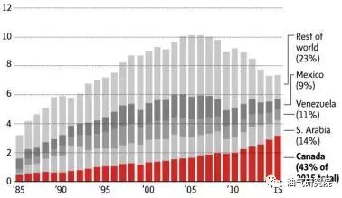 时至今日,加拿大已经成为美国第一大原油进口国。过去五年,美国从国外进口原油的总量持续减少,但是加拿大原油进入美国市场的数量,却一直保持增长。根据EIA数据,2015年美国平均每日进口原油740万桶,其中43%来自加拿大,14%来自沙特阿拉伯,11%来自委内瑞拉,9%来自墨西哥,23%来自其他国家。显然,对美国来说,沙特原油与加拿大原油相比,其重要性已经不可同日而语。