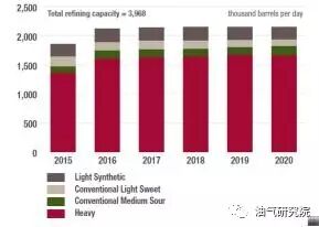 在上图中,不同颜色代表着来自不同产地的原油。浅蓝色代表美国阿拉斯加原油,深蓝色代表阿拉斯加以外的美国原油,绿色代表沙特阿拉伯、墨西哥、委内瑞拉等国原油,橘黄色代表加拿大大西洋[0.49% 资金 研报]沿岸近海原油,红色代表加拿大西部原油。