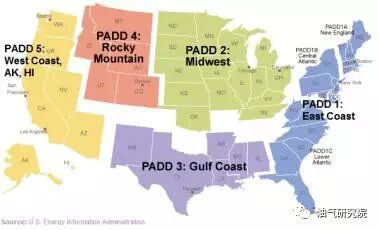 (其中PADD I代表东海岸,PADD II代表中西部,PADD III代表墨西哥湾,PADD IV代表落基山区,PADD V代表西海岸)