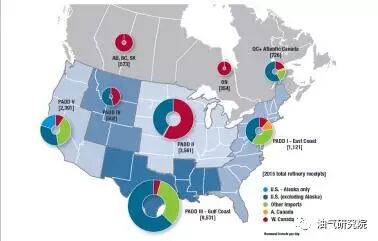 PADD I代表的东海岸有9个精炼厂,每天可加工原油130万桶。2015年,这些精炼厂加工原油110万桶,近2/3来自国外。不过,加拿大原油在这里没有优势,只拥有25.7万桶份额,其中一半来自加拿大西部,一半来自加拿大大西洋近海。