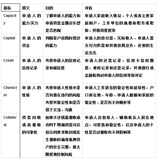 5C原则是针对零售业务申请人的客观具体情况进行全方位评估的一组重要参数指标,一般而言金融机构会从5个方面来评估申请人是否符合自己的价值观,以此对零售申请做出信贷决定的信贷标准。下表的详细分析可以帮助我们更好的理解这个基本概念。