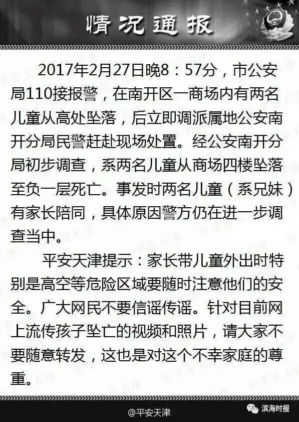 昨天晚上9:00左右,天津大悦城4楼,一家长手里抱着两个孩子靠近中间玻璃围栏天井处,孩子没抱住,两个孩子全部掉到该商场负一层身亡……两个小小的身体静静地躺在血泊中……