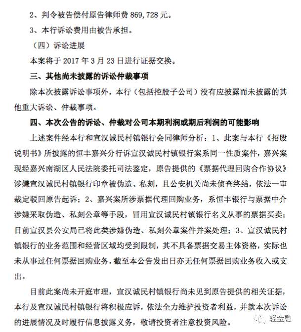 网易财经查阅相关公告发现,2016年4月11日,宣汉诚民村镇银行收到浙江嘉兴市南湖区人民法院寄发的七张传票和应诉通知书。根据该七份民事起诉状,恒丰银行股份有限公司嘉兴分行(原告或恒丰银行嘉兴分行)向嘉兴市南湖区人民法院起诉宣汉诚民村镇银行(被告),诉讼的主要事实和理由为:被告与原告签订《票据代理回购业务合作协议》,委托原告代理被告作为票据回购式转贴现业务的申请人,向第三方办理代理回购业务;由于被告在所代理票据回购到期日未按时将回购票据票面金额汇入原告指定账户,导致原告作为代理行向其他商业银行卖断所涉票据而产生垫付票款利息损失或部分自行买断所涉票据而产生垫付资金利息损失。