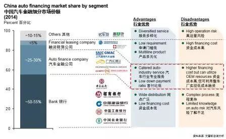 目前在中国汽车金融领域,主要的参与机构包括银行(消费信贷和信用卡)、汽车金融公司、融资租赁公司、互联网金融和P2P机构。就目前中国汽车金融市场的份额来看,银行贷款占比超过50%,银行在汽车金融领域具备网点广泛、资金成本低的先天优势,但劣势在于对消费者而言,流程相对复杂,汽车专业知识不足;专业汽车金融公司的市场份额占比在25%到30%之间,相对而言,它们提供的产品首付比例低,服务更为专业,缺点则是资金成本相对银行较高;剩下的20%-25%的市场份额则被融资租赁公司和互联网金融公司所占据,他们的特色优势是申请门槛低,并且拥有多元化的产品线,当然随之而来的是资金成本高,运营风险高的劣势。