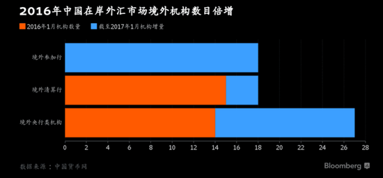 截至2017年1月,在岸即期外汇市场成员数量较上年增长近14%至600家,其中境外机构数量几近翻一番至63家。除了境外央行类机构和境外清算行增加外,部分境外人民币业务参加行也得以作为新一类交易主体直接进入境内外汇市场。