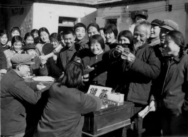 1979年,农信社信贷人员在村中进行生产队年终分配时的情景