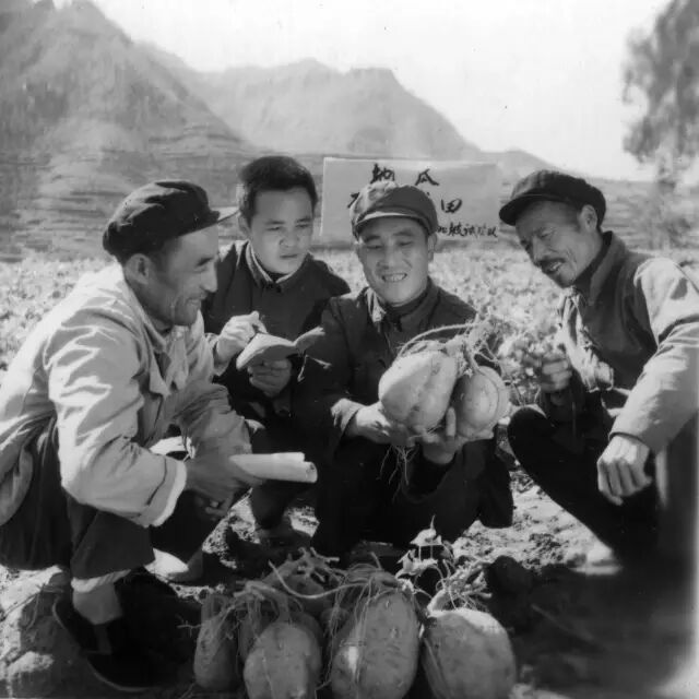 1977年,农信社工作人员田间地头与村队负责人查看地瓜生产情况