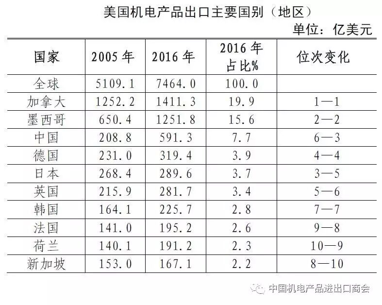来源:中国机电产品进出口商会美国机电产品进出口市场广阔,相对集中。近年来与中国贸易快速增长,表现抢眼。1美国机电产品进出口市场情况2016年