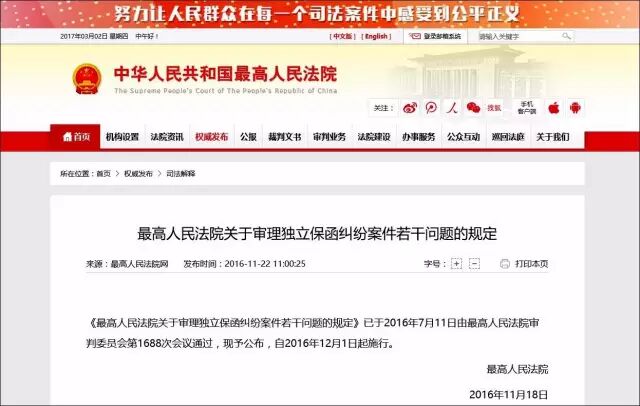 《最高人民法院关于审理独立保函纠纷案件若干问题的规定》(以下简称“《规定》”)已于2016年12月1日起实施。该《规定》首次明确承认了国内独立保函的有效性,而此前,中国独立保函的适用则受到严格限制,即:中国仅承认涉外独立保函的合法性,而在国内民事活动中则禁止使用独立保函。
