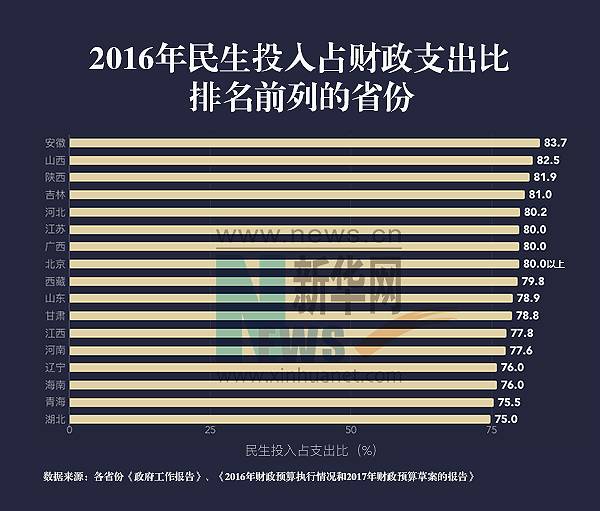 查阅31个省份的财政年度数据可发现,2016年,各地开足财政马力,民生投入占支出比普遍超过了三分之二,有17个省份的这项数据在75%以上;2017年,面临财政收入增幅回落与支出刚性增长的矛盾,各地积极部署,着力优化支出结构,要求坚持过“紧日子”,但在脱贫、就业、养老、医改、教育等领域优先安排,确保支出强度增、规模扩。