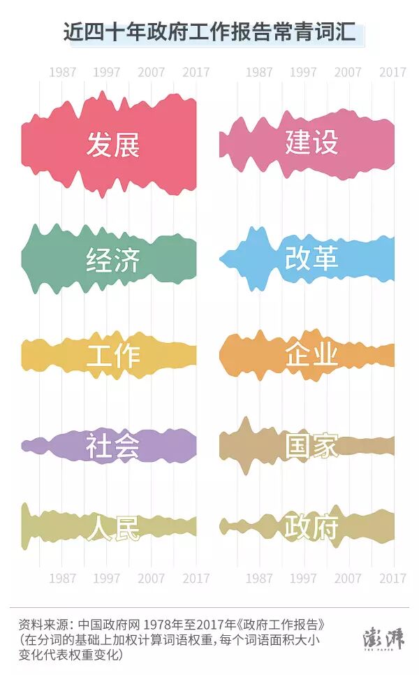 3月5日,第十二届全国人民代表大会第五次会议在北京人民大会堂开幕。国务院总理李克强作政府工作报告。澎湃新闻(thepaper.cn)整理了中国政府网上1978年至2017年共计40份《政府工作报告》中的常青词汇。结果显示,“发展”、“建设”、“经济”、“改革”等词语在过去40年中一直高频出现。